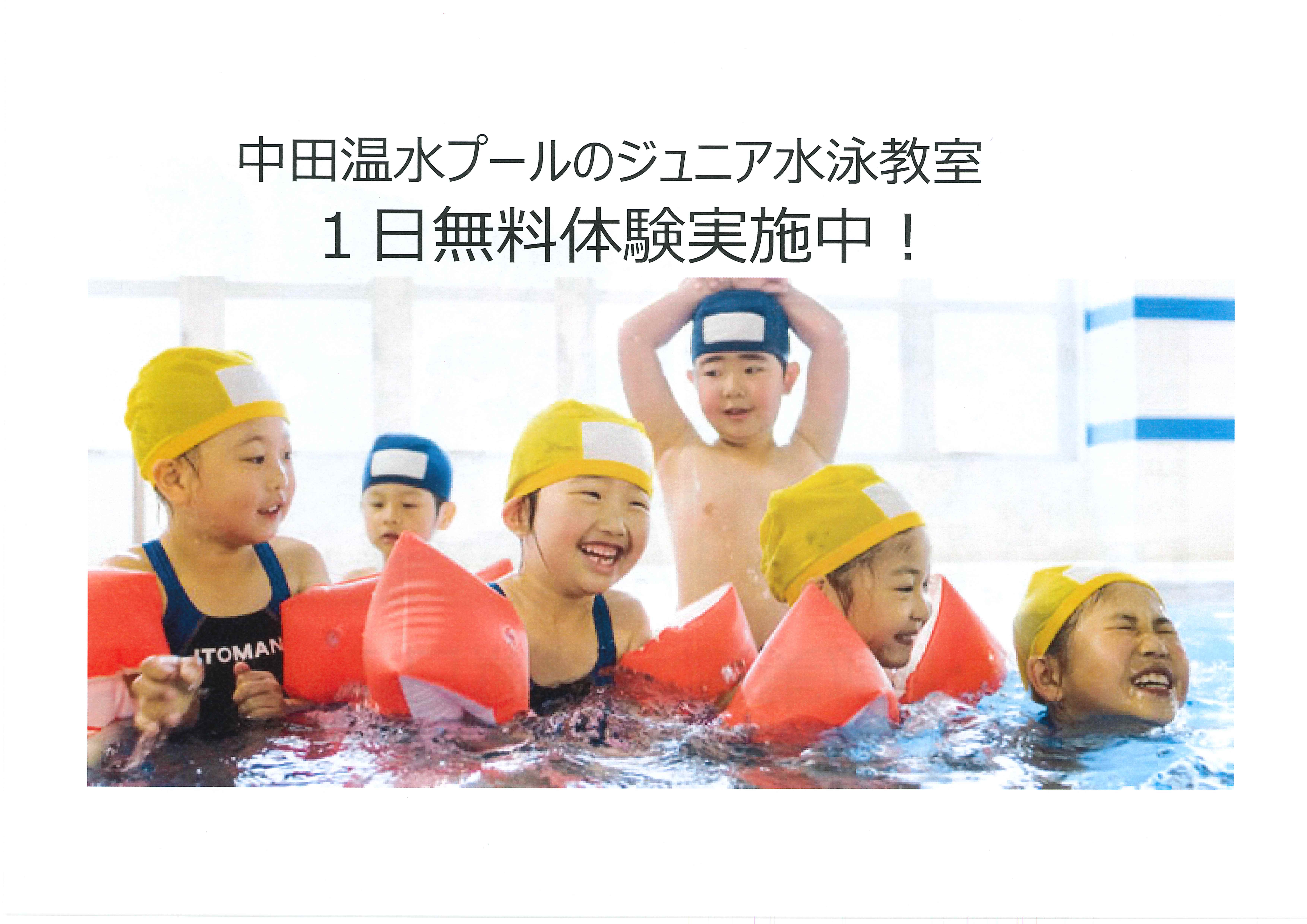 中田温水プールでは、幼稚園、小学生、中学生を対象としたジュニア水泳教室の1日無料体験を実施中です。