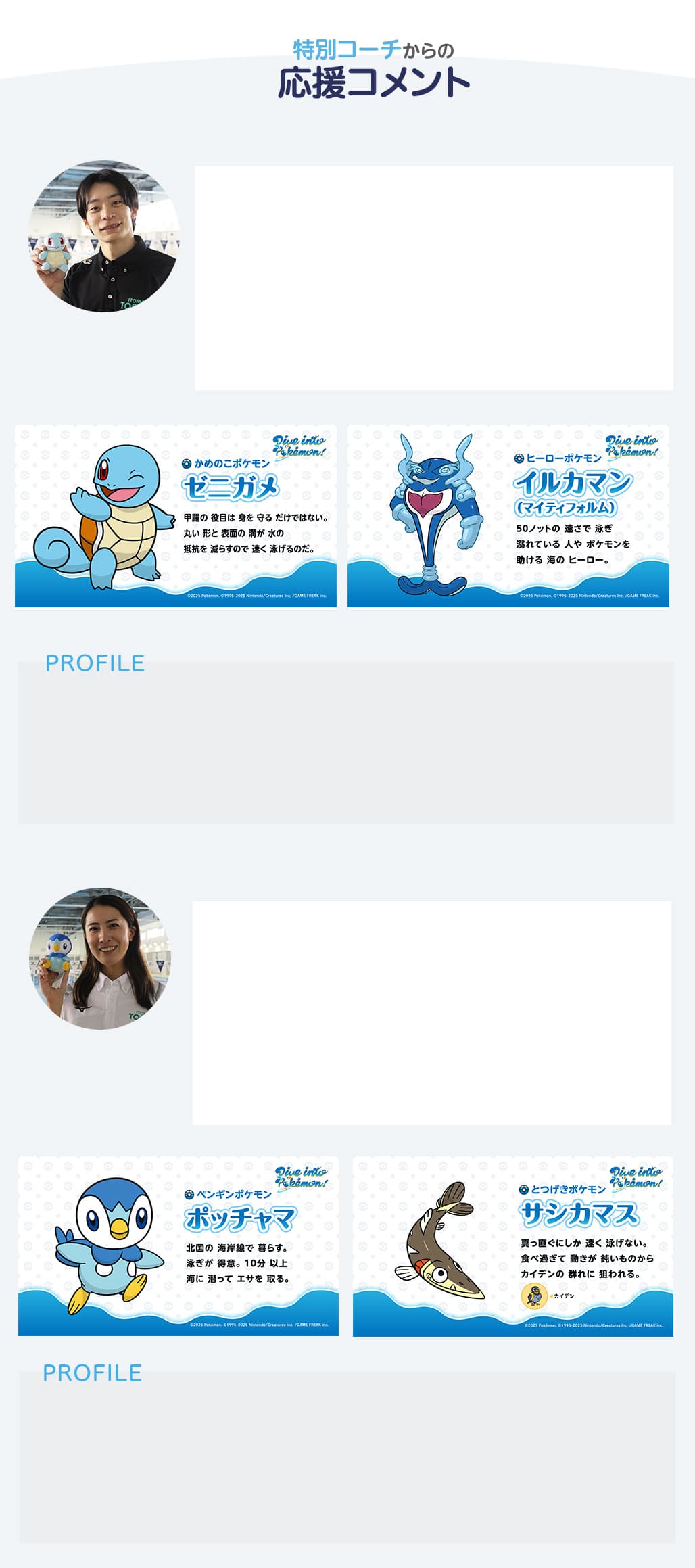今回の取り組みで、真っ直ぐにしか速く泳げないサシカマスなど、みずタイプのポケモンだけでもこれだけたくさんの種類がいることを知りました。私は小さい頃、プールに練習しに行くというよりは友達に会えることが楽しみだったので、みなさんもプールにいるポケモンに会えることを楽しみにして、ポケモンたちと一緒に元気にプールの練習に励んでくれると嬉しいです!
