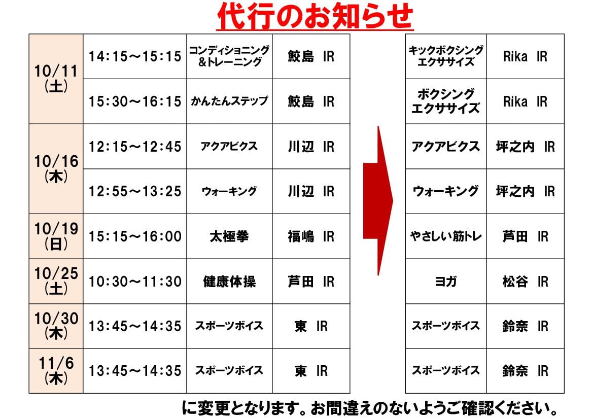 10月11日(土)・16日(木)・19日(日)・25日(土)・30日(木)・11月6日(木)レッスン代行のお知らせ