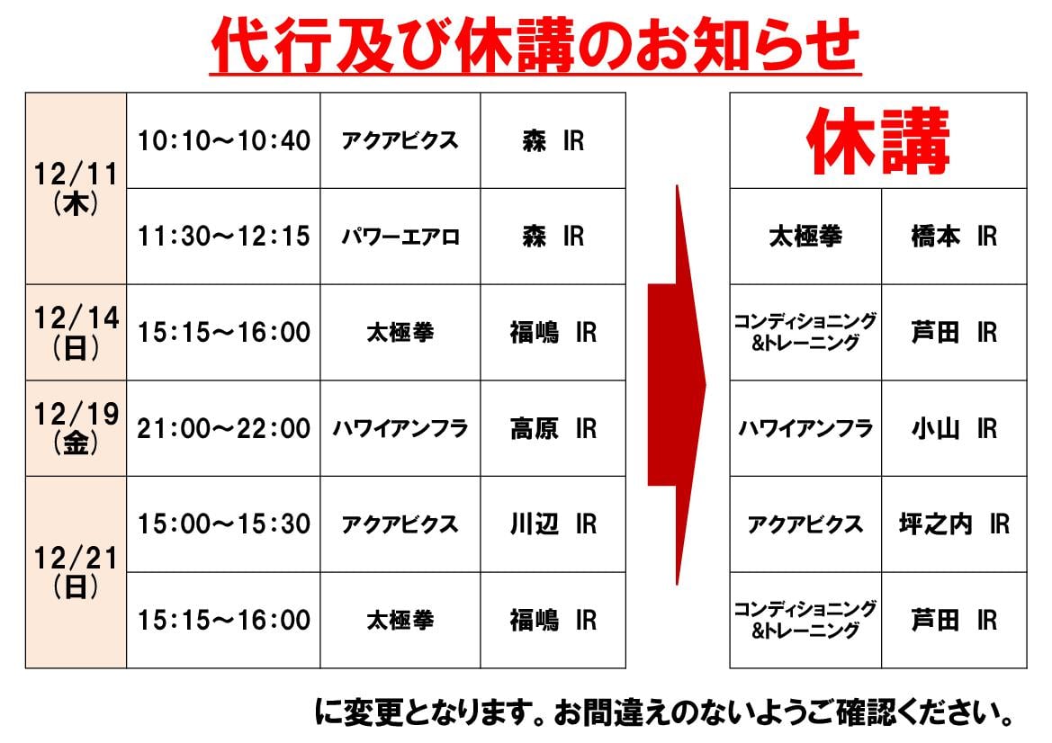 12月11日(木)・14日(日)・19日(金)・21日(日)レッスン代行及び休講のお知らせ