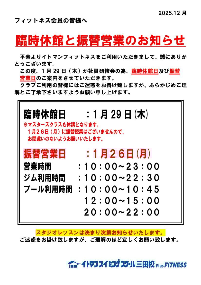 1月7日(水)・10日(土)・15日(木)・20日(火)レッスン代行及び休講のお知らせ