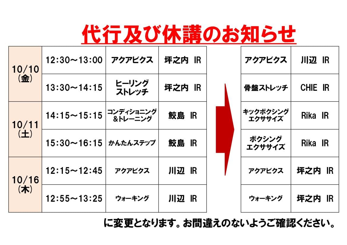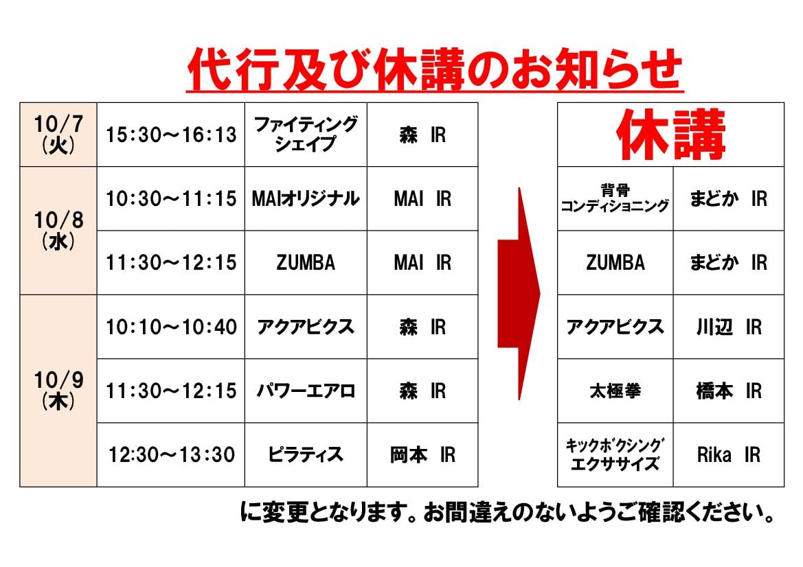 10月7日(火)・8日(水)・9日(木)・10日(金)・11日(土)・16日(木)レッスン代行及び休講のお知らせ