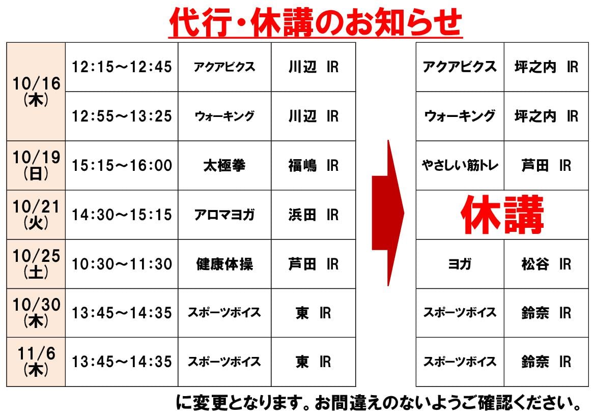 10月16日(木)・19日(日)・21日(火)・25日(土)・30日(木)・11月6日(木)レッスン代行・休講のお知らせ