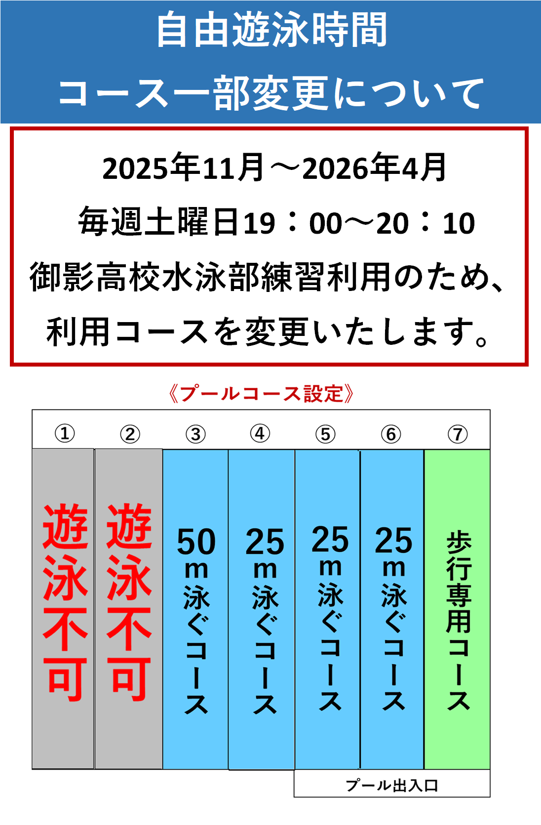 【2025.10~2026.4】毎週土曜日19:00~20:10自由遊泳時間の利用可能コース数を変更いたします。