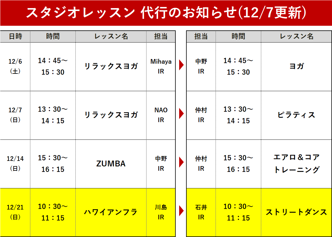 【12月度】レッスン代行のお知らせ(12/7更新)