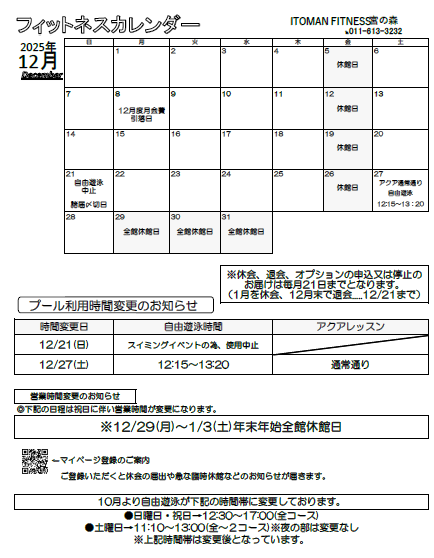【12月21日 (日) スタジオレッスン休講のお知らせ】