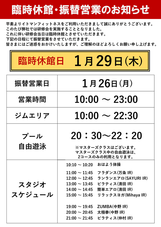 【重要】臨時休館・振替営業のお知らせ