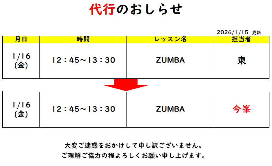 1/16(金)スタジオレッスン代行のお知らせ