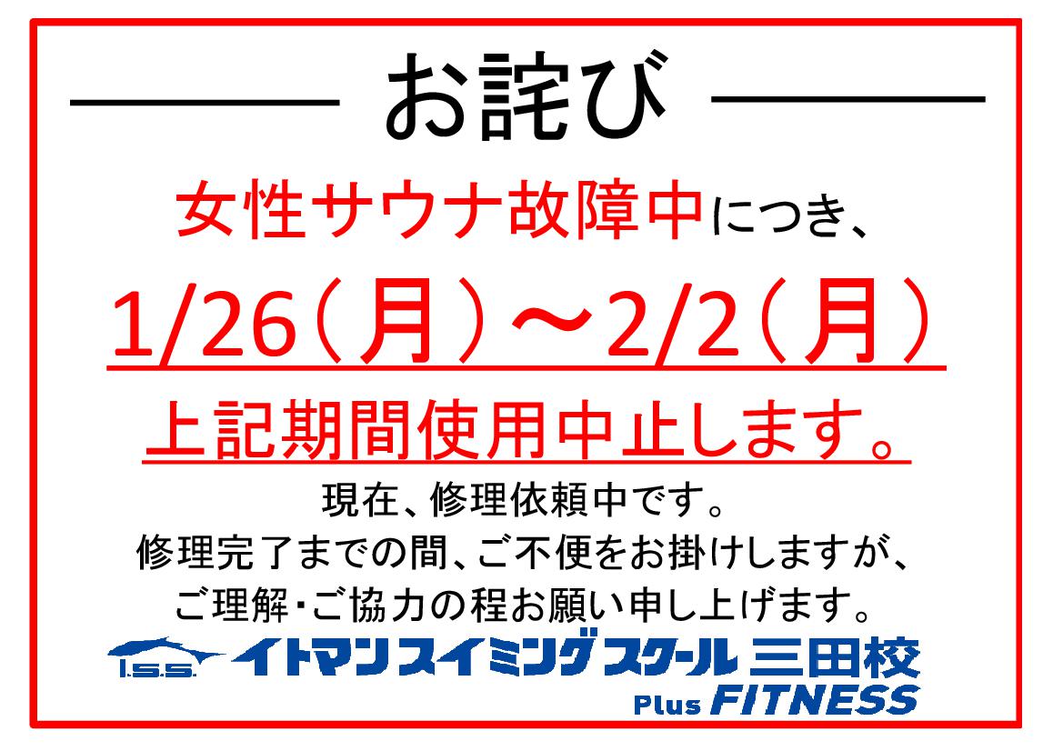 1月26日(月)~2月2日(月)女性サウナ使用中止のご案内