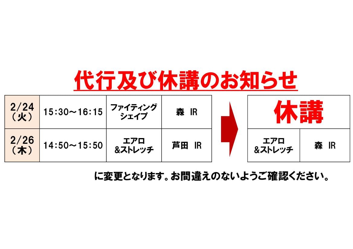 2月24日(火)・26日(木)代行及び休講のお知らせ