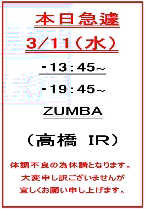 ※【急遽 3/11(水) スタジオレッスン休講のお知らせ】