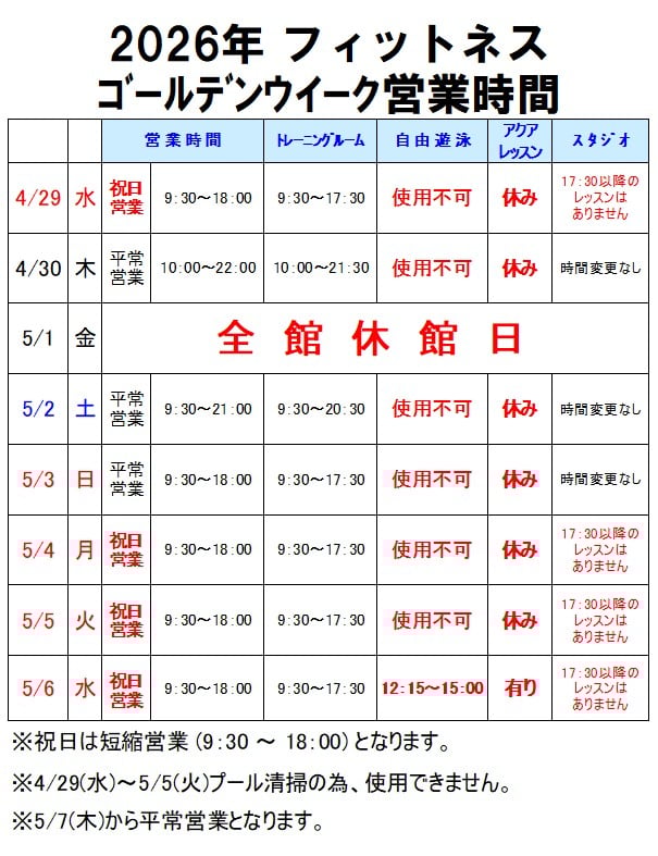 【5月4日 (月) スタジオレッスン休講のお知らせ】