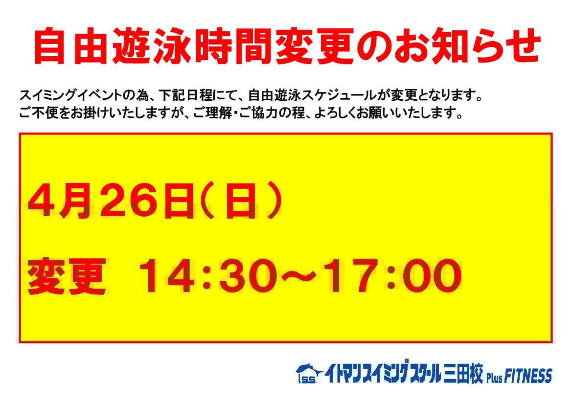 4月26日(日)自由遊泳時間変更のお知らせ