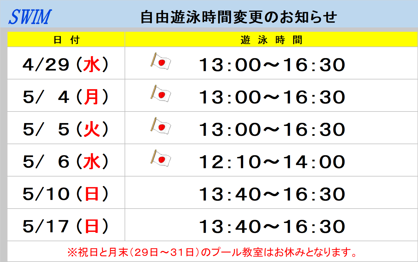 GW 営業時間・自由遊泳時間のお知らせ