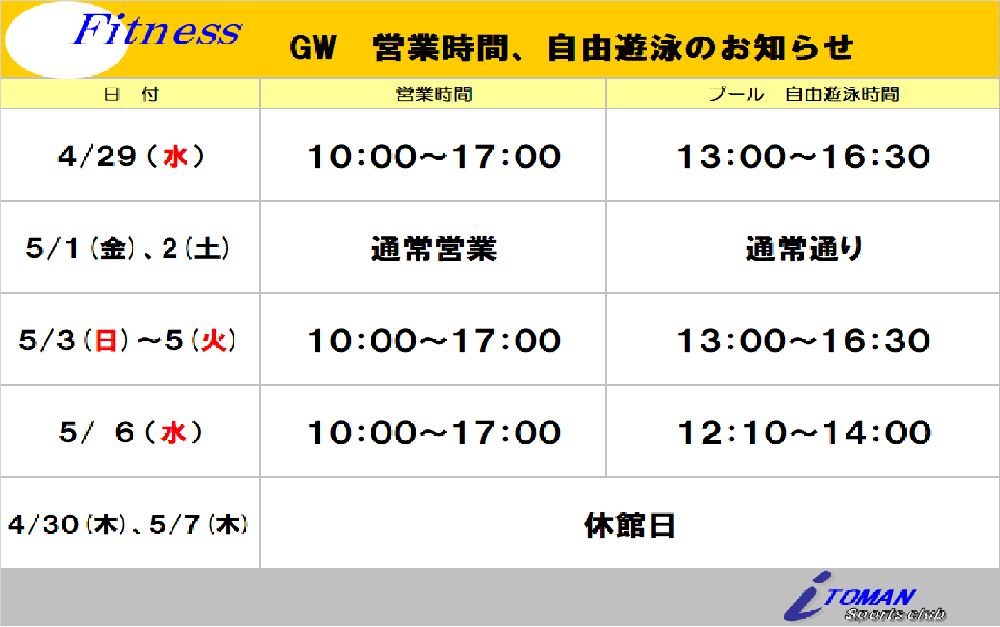 GW 営業時間・自由遊泳時間のお知らせ
