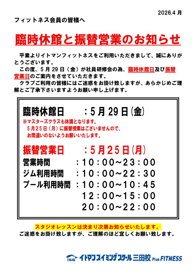 5/20(水)レッスン代行及び休講のお知らせ