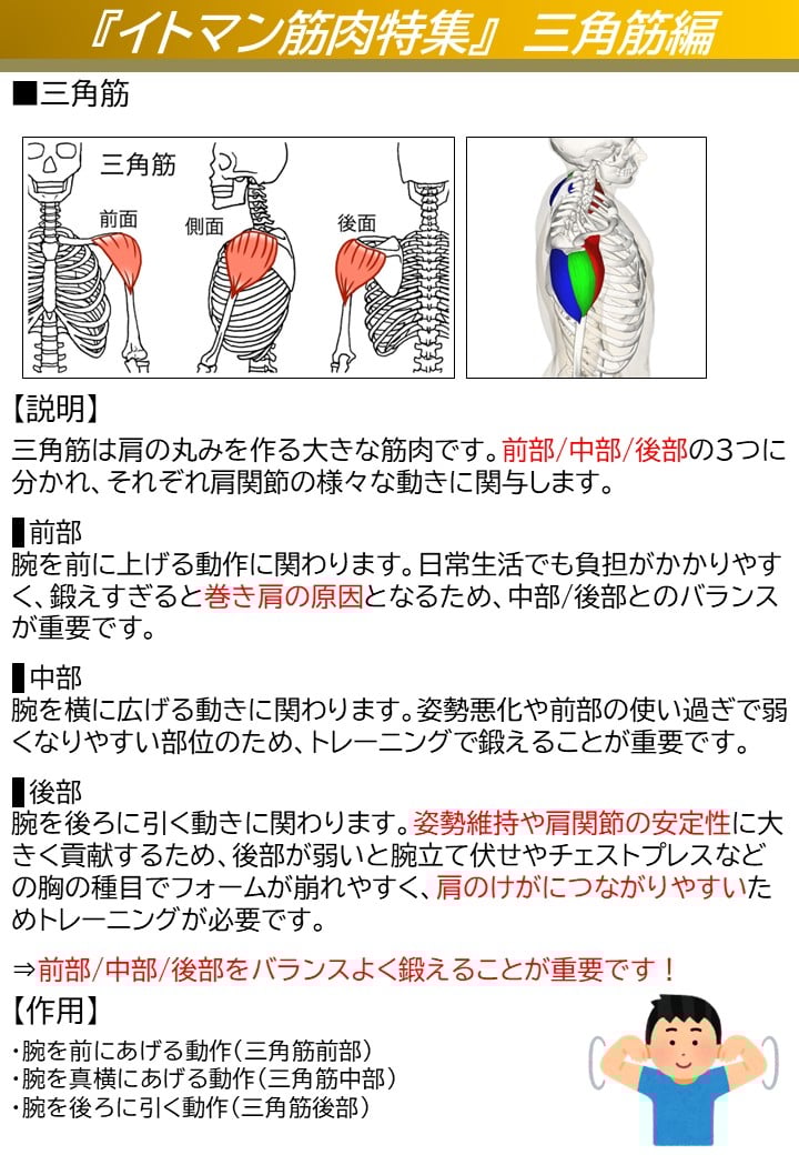 今回の特集は三角筋です。三角筋は肩の丸みを作る筋肉で前部/中部/後部の3つに分かれています。