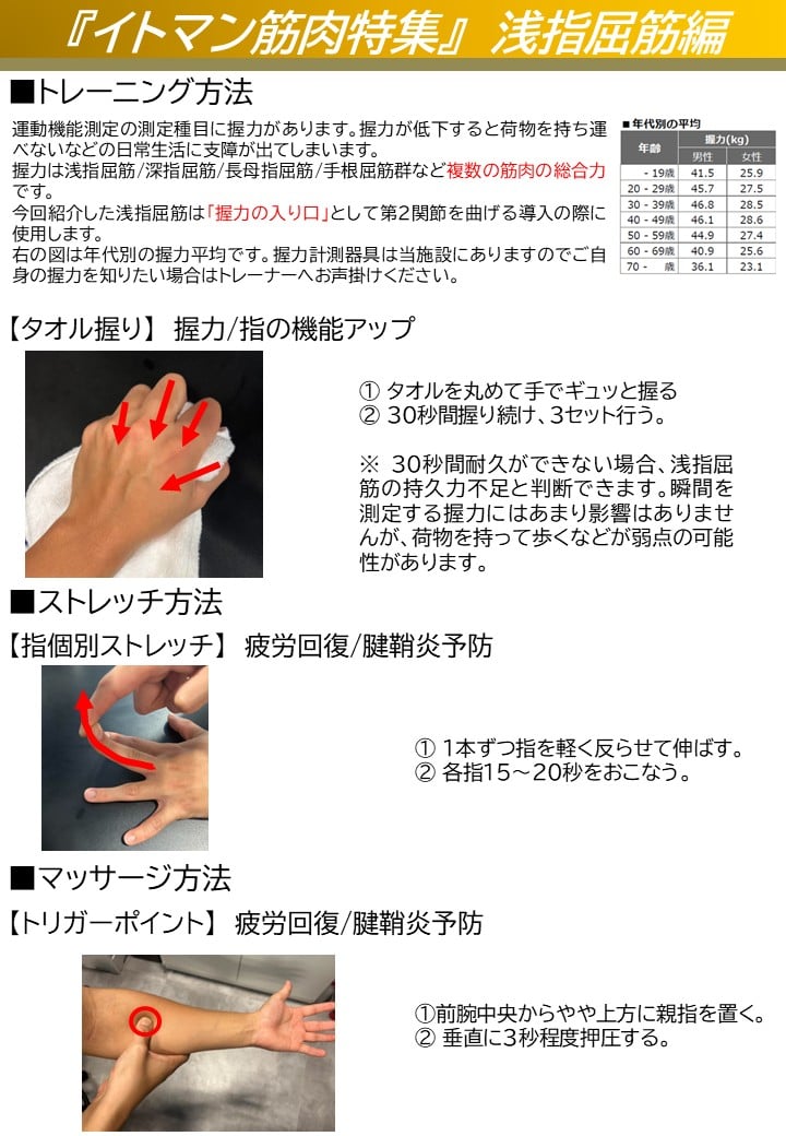 イトマングランドフィットネスでは、皆様の健康づくりのサポートをする一環として毎週、館内掲示板やメールにて筋肉の作用やトレーニング/ストレッチ方法を取り上げた『筋肉特集』を発信しております。