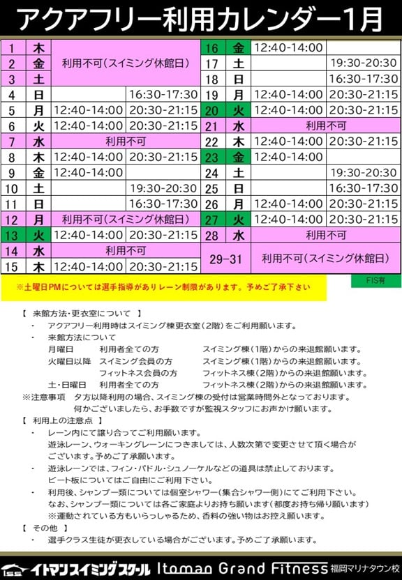 1月アクアフリーカレンダー