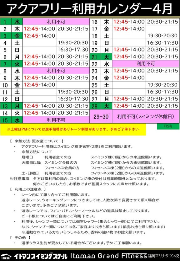 4月アクアフリーカレンダー