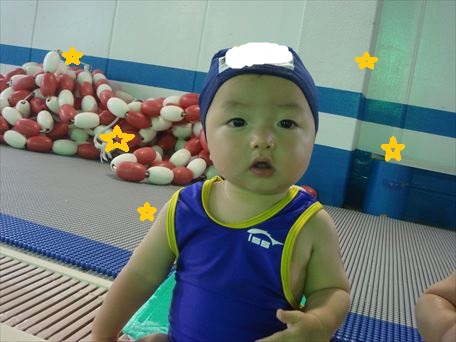 プールサイドにお座りしてカメラ目線、とってもかわいいですね!