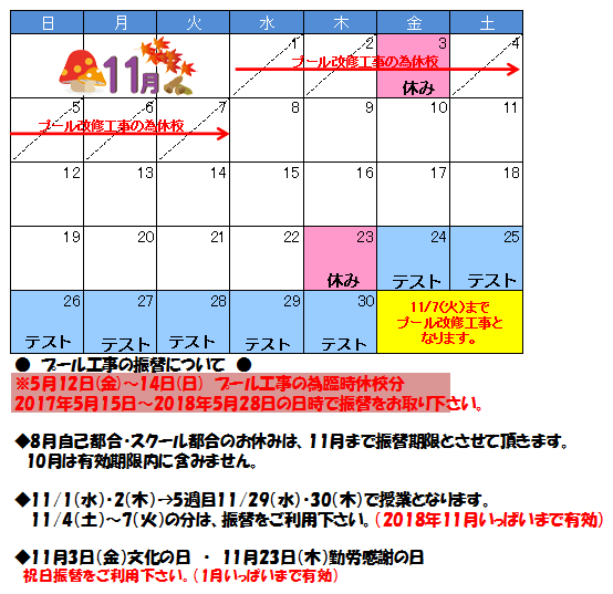 さて、11月は7日までプール改修工事を実施しておりましたので、