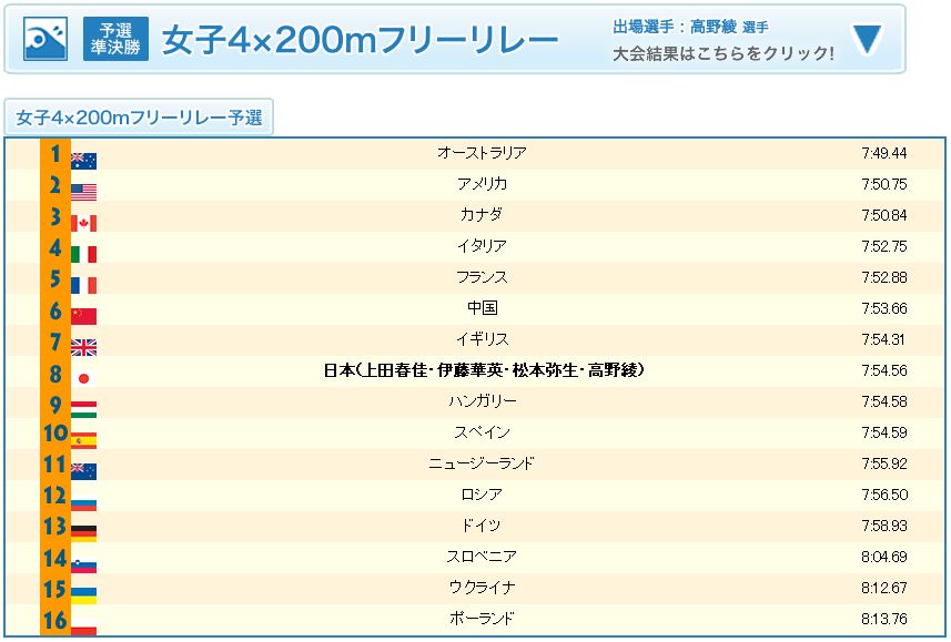 ★2012ロンドンオリンピック情報★女子4×200mリレー決勝進出!