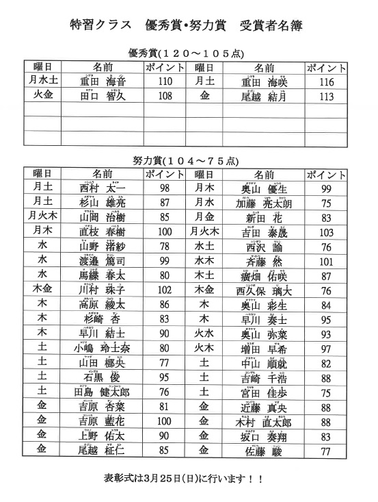 特習クラス 優秀賞・努力賞受賞者♪