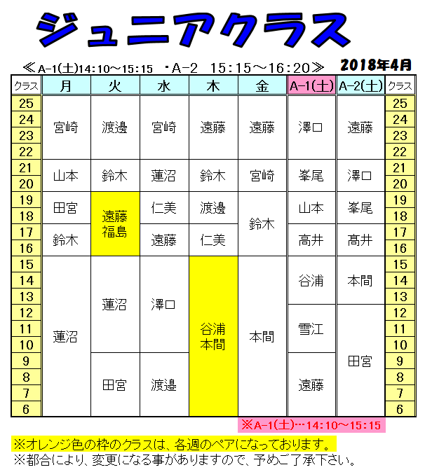 | クラス名 | 時 間 | 日 | 月 | 火 | 水 | 木 | 金 | 土 |