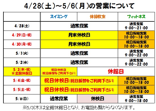 スイミング・体操教室は、明日5日(土)までは、祝日の為お休みとなります。