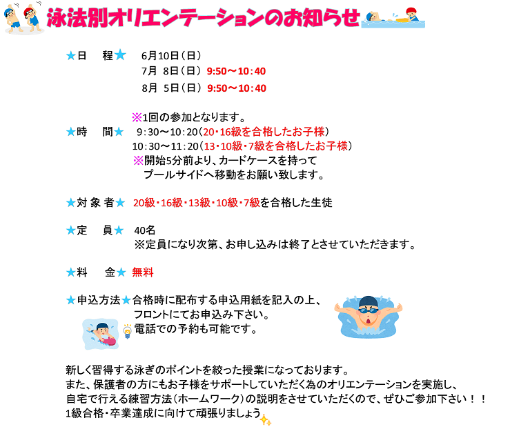 6月〜8月泳法別オリエンテーションのお知らせ