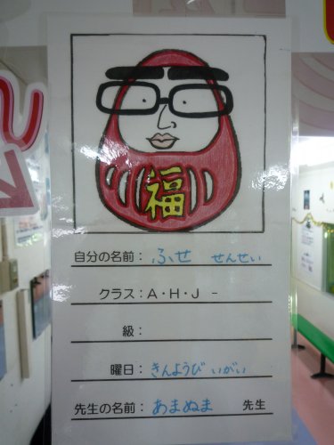 今、みなさんに配布されているお手紙のだるまさんのお顔の中に大好きな先生の似顔絵を書いて持ってきてください!!