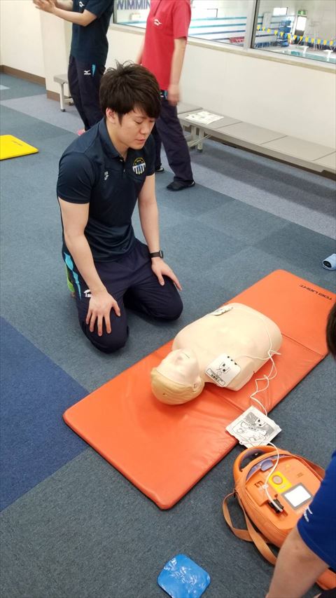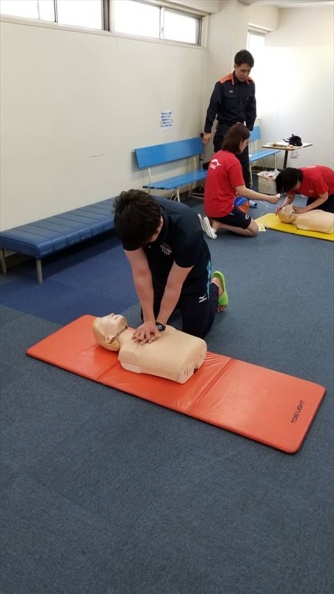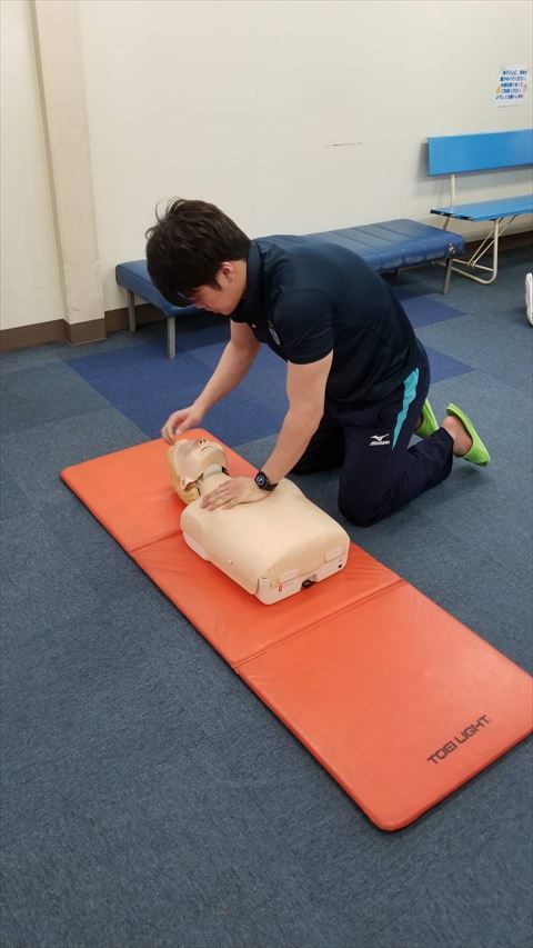 4月26日(金)のお昼に玉出校の2階ギャラリーにて救急法の訓練を行いました!