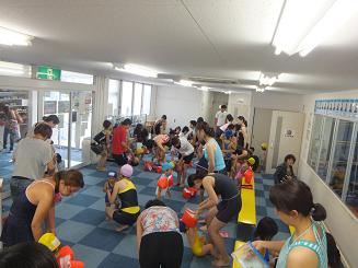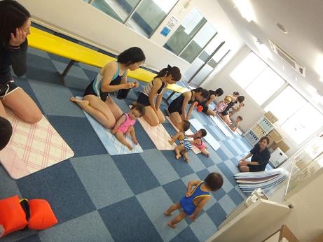 ベビークラスでは入水前にお母さんと先生と楽しく一緒に体操をします