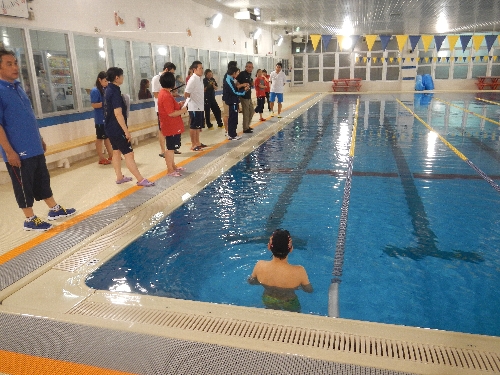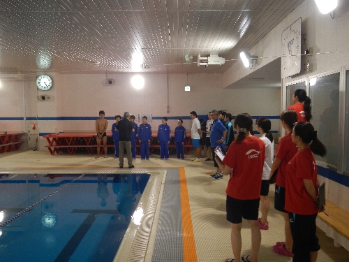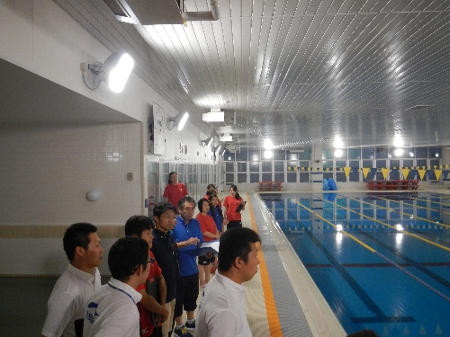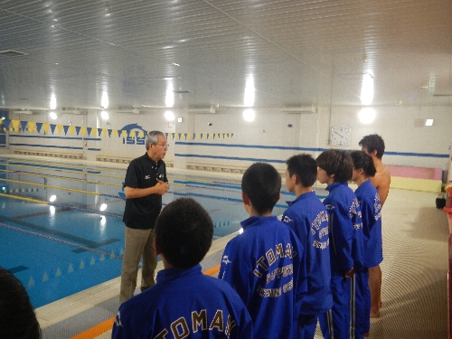 選手の泳ぎを見ながら会長が