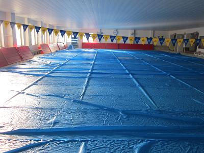 お休みのプール。施設保全・プール水保温の為シートをかけています。