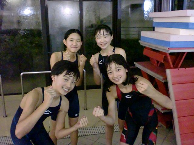また女子200mリレーでは小学生チームが1-59-85で泳ぎ、今月末に行われる「第36回イトマン招待水泳競技大会」の参加標準記録を突破しました! リレーメンバーは一人ひとり大きく自己ベストを伸ばしての突破です! お見事!! ちなみに参加標準記録は1-59-8。 超ギリギリでしたが、本番でも大きく飛躍できるようにガンバろう!