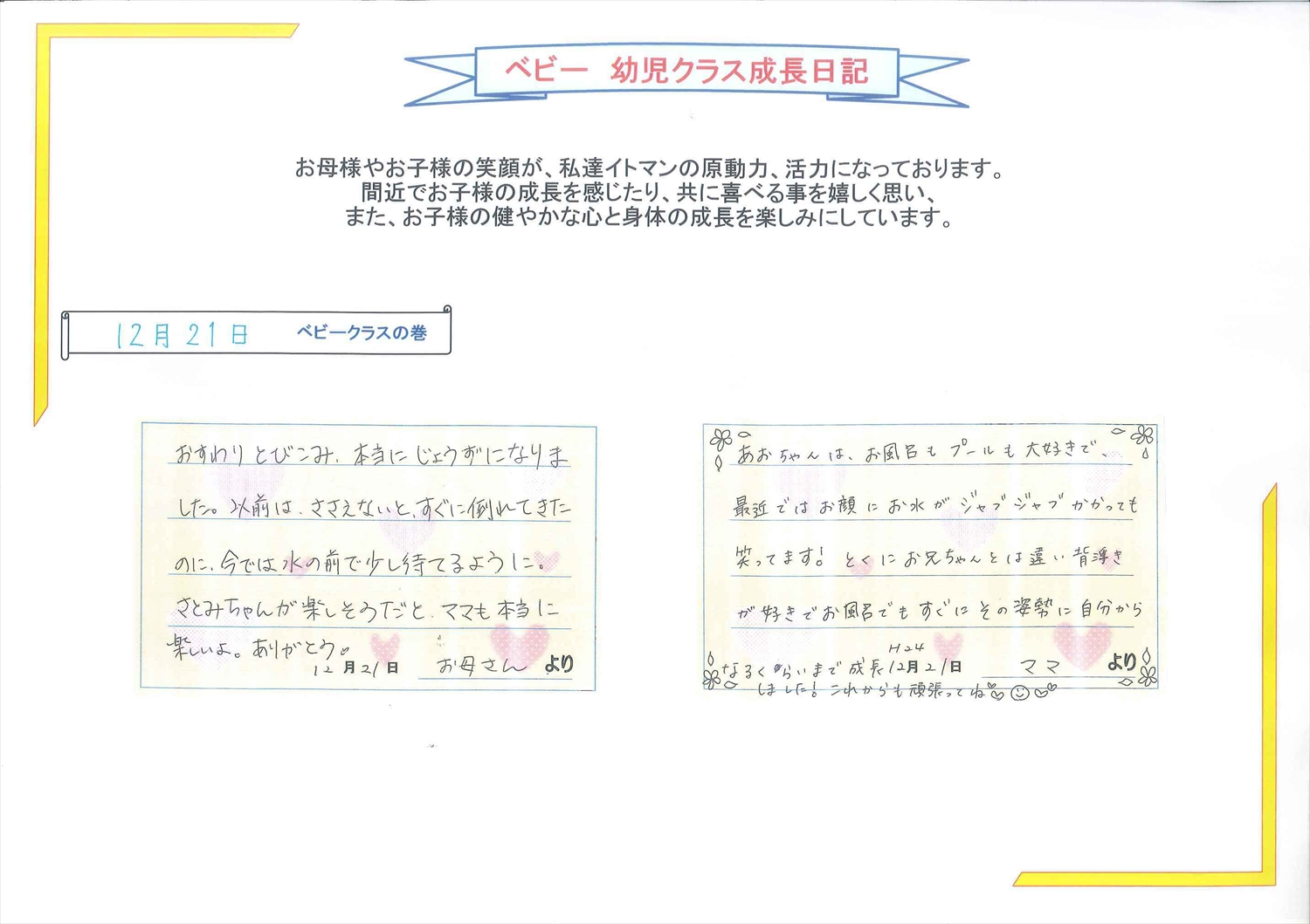 繰り返し、ママと練習してきた成果が出ましたねさとみちゃんとママの笑顔が浮かんできます寒い冬もプールで楽しくあそうぼうねfrom おおもり