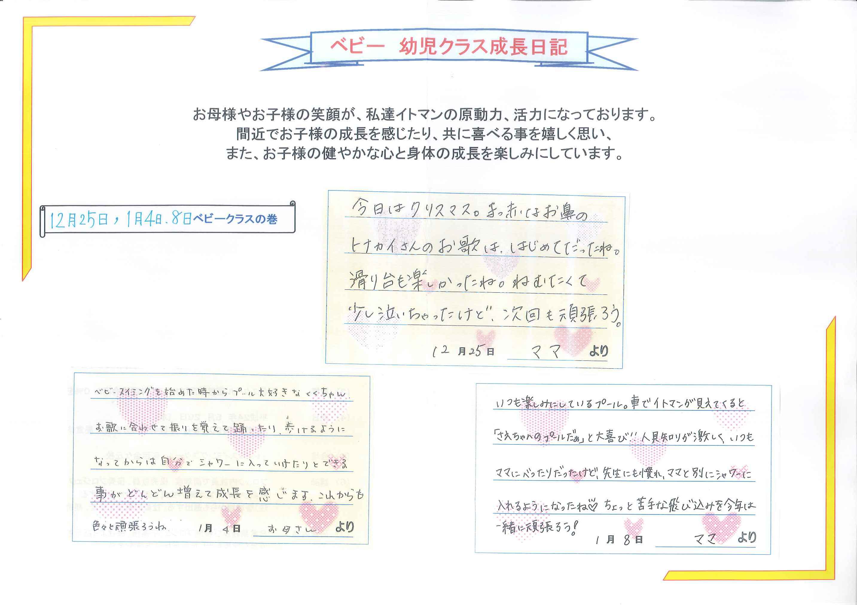 「見てないから大丈夫だよ」と後ろを向いていた先生ですが今ではおはようのタッチ、お魚さん、飛び込みの時には「先生みててね」と言っているかのようにこっちを見てアピールしてくれたりと、とても慣れてくれて嬉しいですいつでもママが「大丈夫だよ」とそっと背中を押してくれていたからですねfrom 抜水