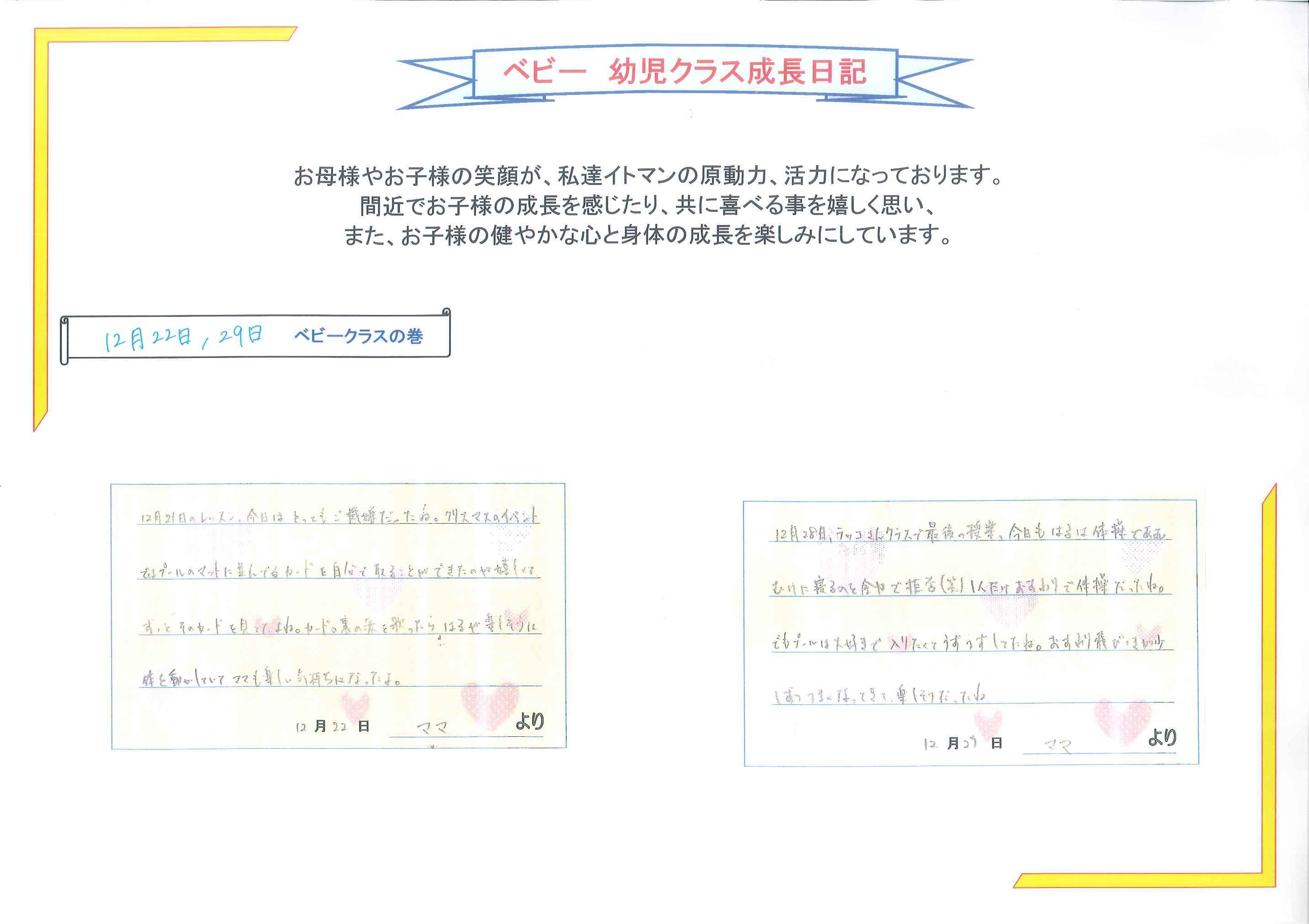 はるくんママ、毎週日記を書いて頂きありがとうございます1回1回の授業で成長していくはるくんの様子がとても伝わってきます表情も豊かになっていくはるくんを見るのが楽しみです