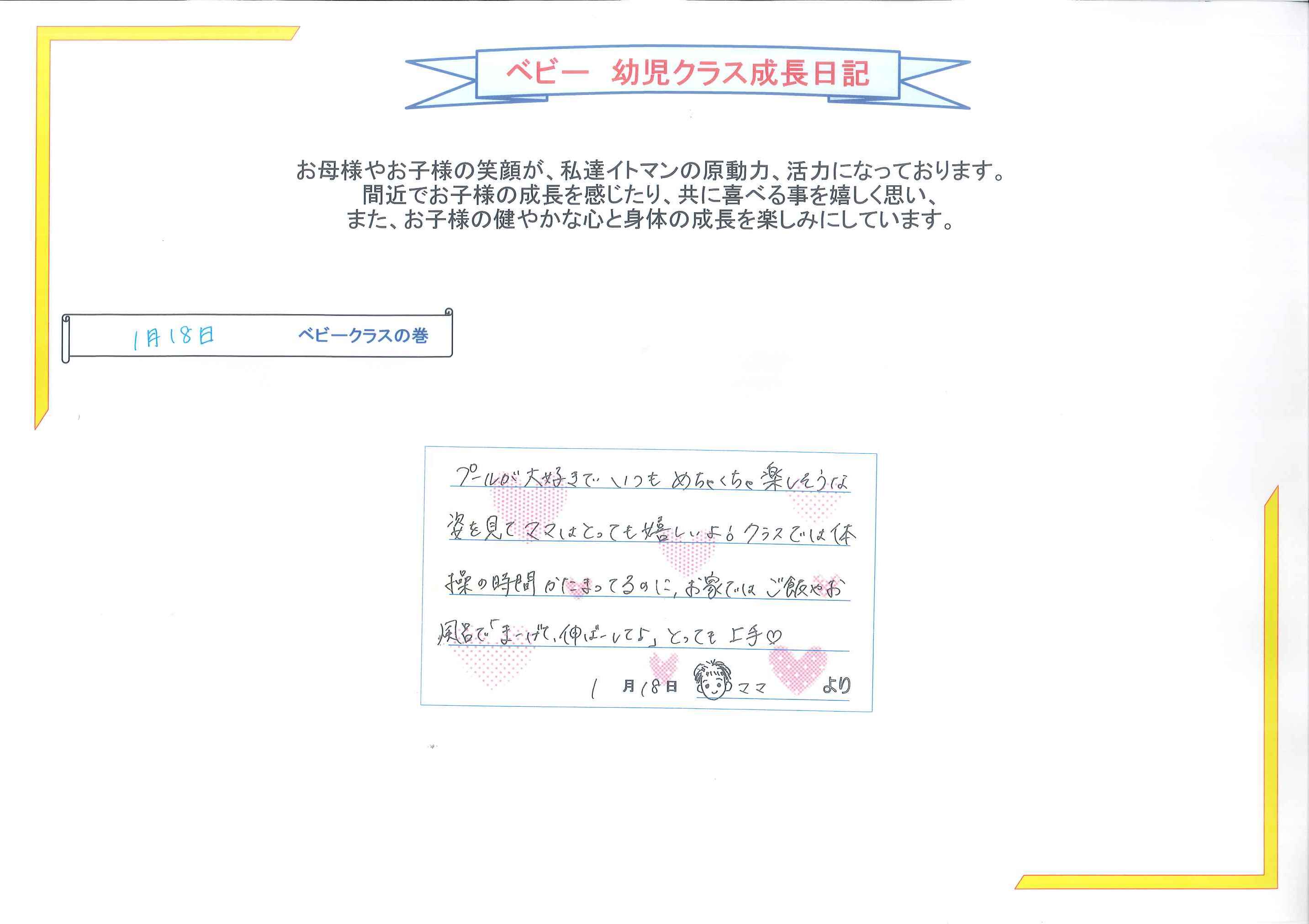 お家で体操をやってくれているなんてとっても嬉しいですヘルパーをつけて泳いだり、今日は潜ったりもしたねこれからもママと一緒に色んな事に挑戦してみようねfrom 大森