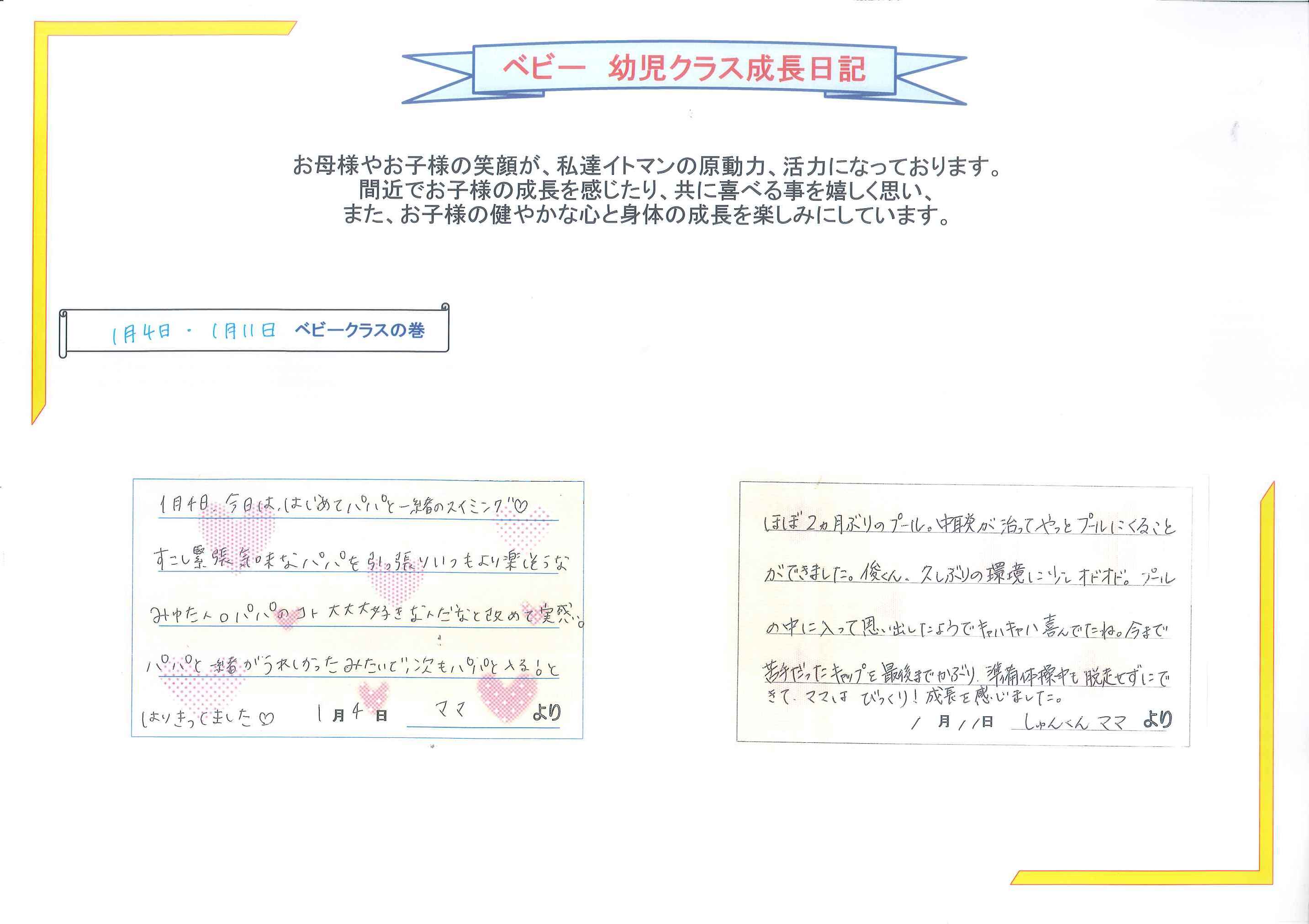 パパもママも近くで見てくれてとても張り切っていましたねみゆたんの笑顔から「うれしい」の気持ちが先生にも伝わってきましたよベビースイミングを通じて笑顔が増える事がとっても嬉しいですfrom おおもり