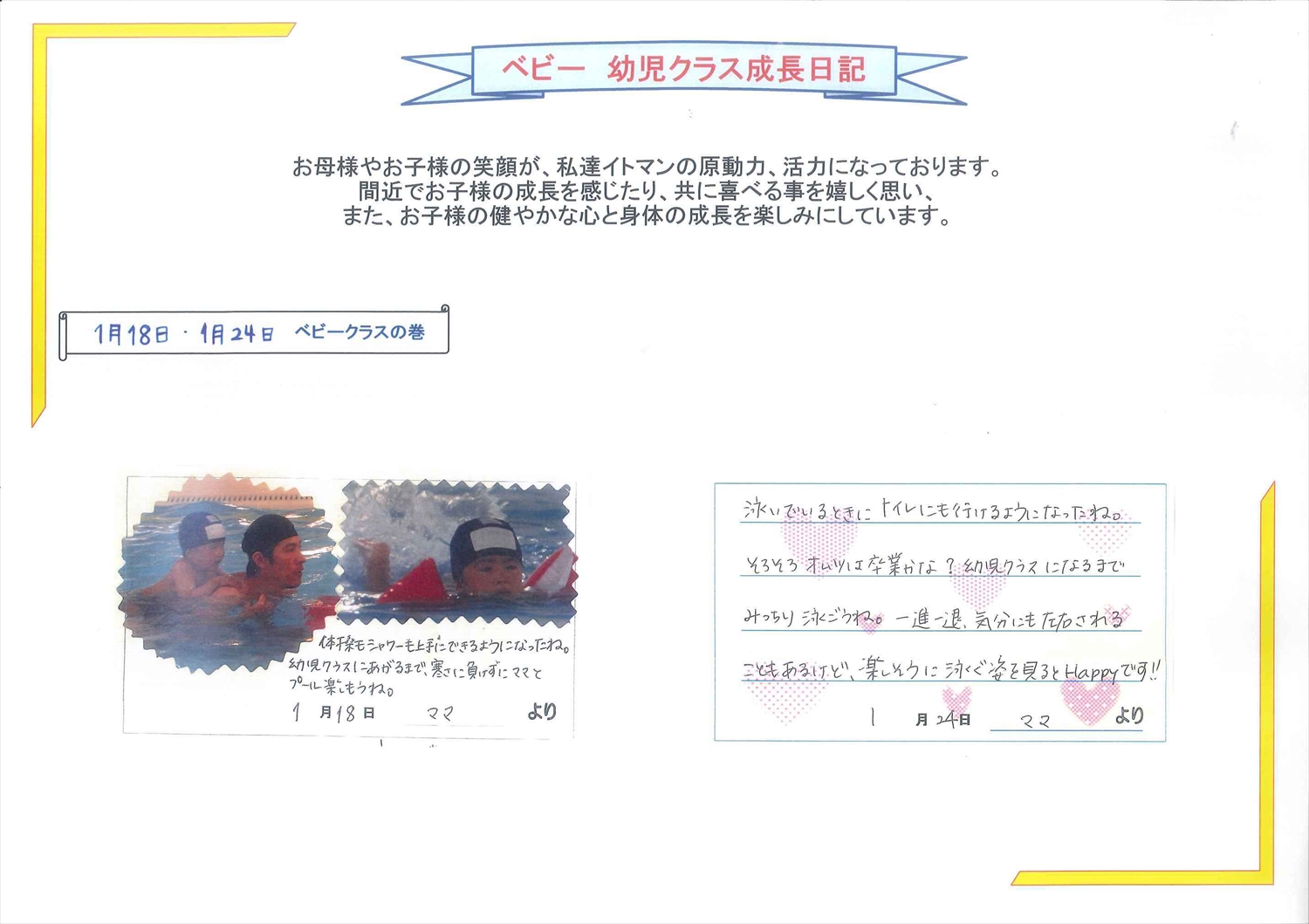 体操も泳ぎもとっても上手になったりっくんお休みもしないで頑張っていますねトイレにも行けるようになって、色々な面で成長している姿を見れて先生も毎回楽しみにしていますfrom 古木