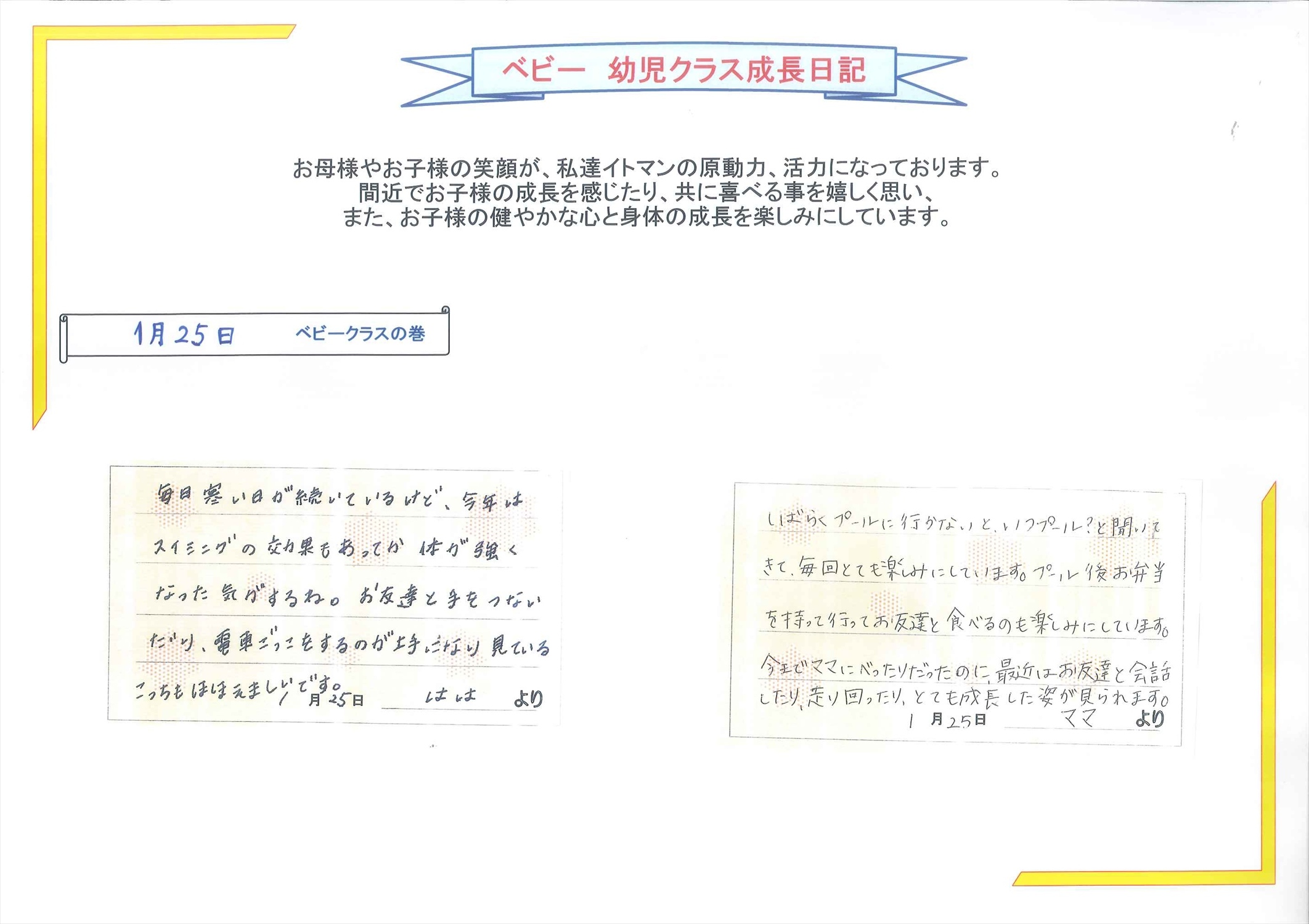 プールの中で笑顔が増えてきたさえちゃん楽しんでいますね今日は大きな声で「おはようございます」と言ってくれて先生は驚き嬉しく、とても成長を感じましたこれからも、ママ、お友達、先生と一緒に楽しく遊ぼうねfrom 抜水