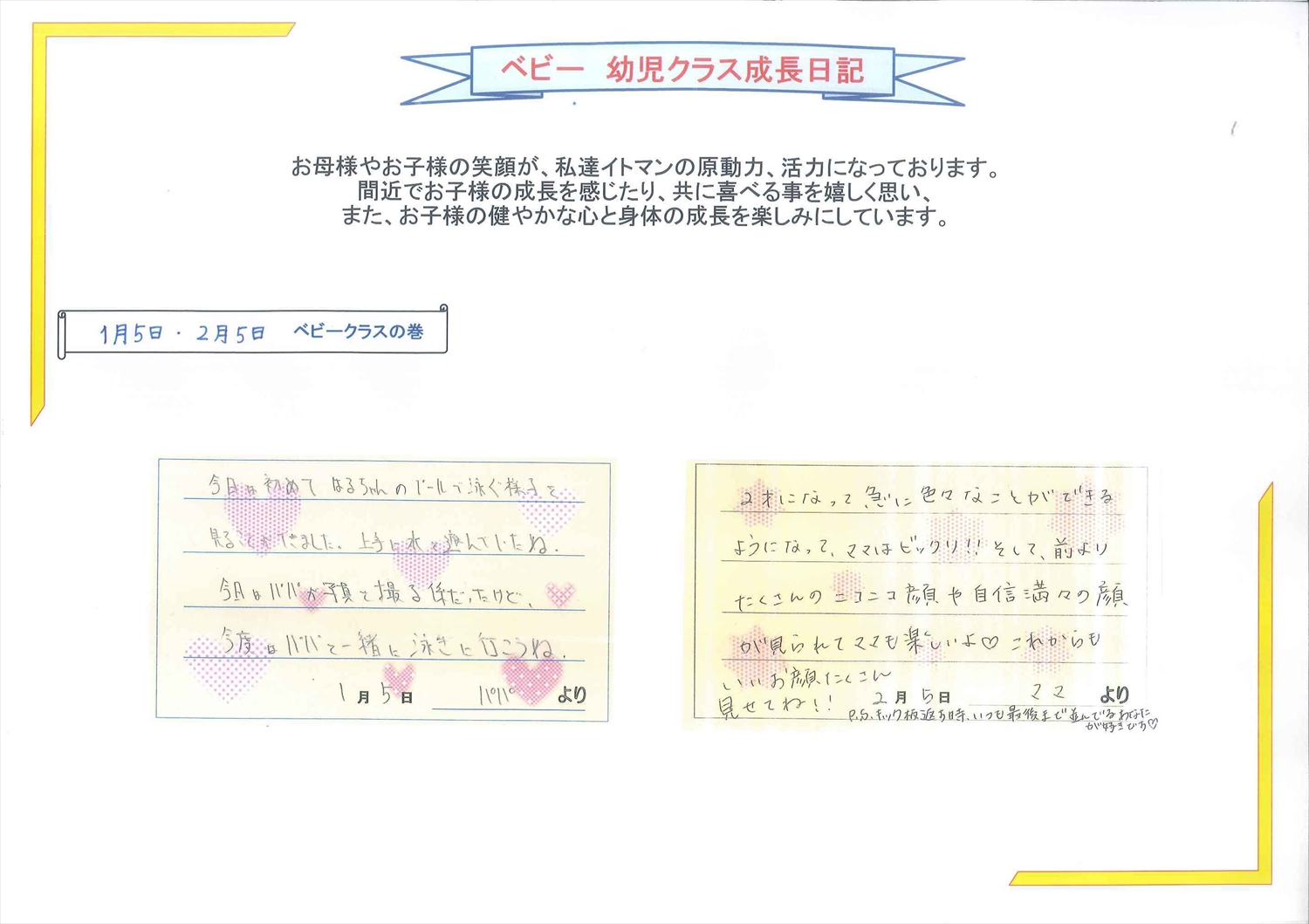 ヘルパーをつけて泳いだり、ジャンプから潜ったり出来る事が増えて自信がついたのかな笑顔の日が増えて、先生もとても嬉しいです得意な事をグーンと伸ばしていこうfrom おおもり