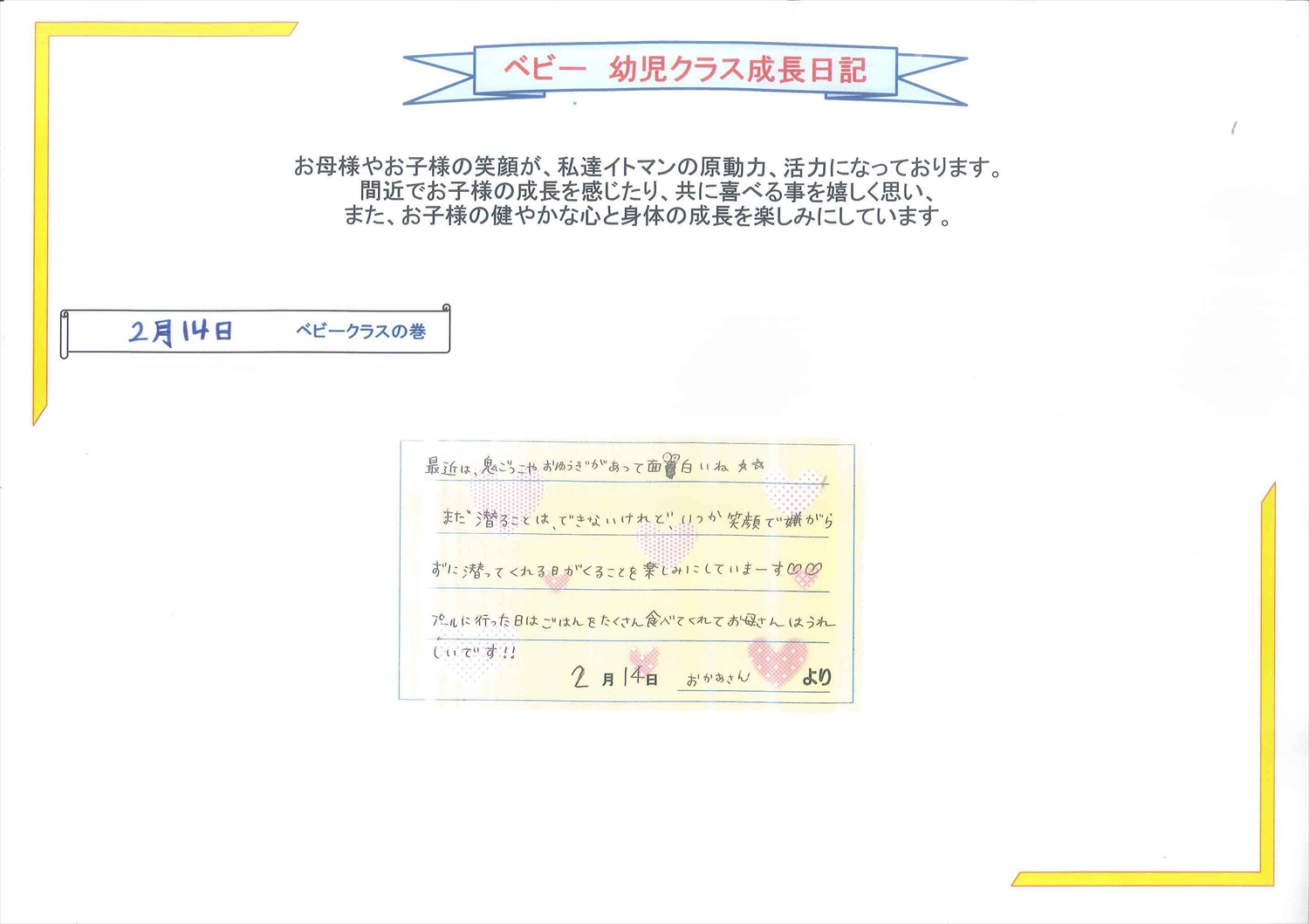 2月はイベントが盛りだくさん楽しんでもらえているようでとても嬉しいですごはんをたくさん食べているのもプールで元気いっぱい体を動かしているからですねこれからも楽しく遊んで、心も体も成長していく姿を見れるのを楽しみにしていますfrom 抜水