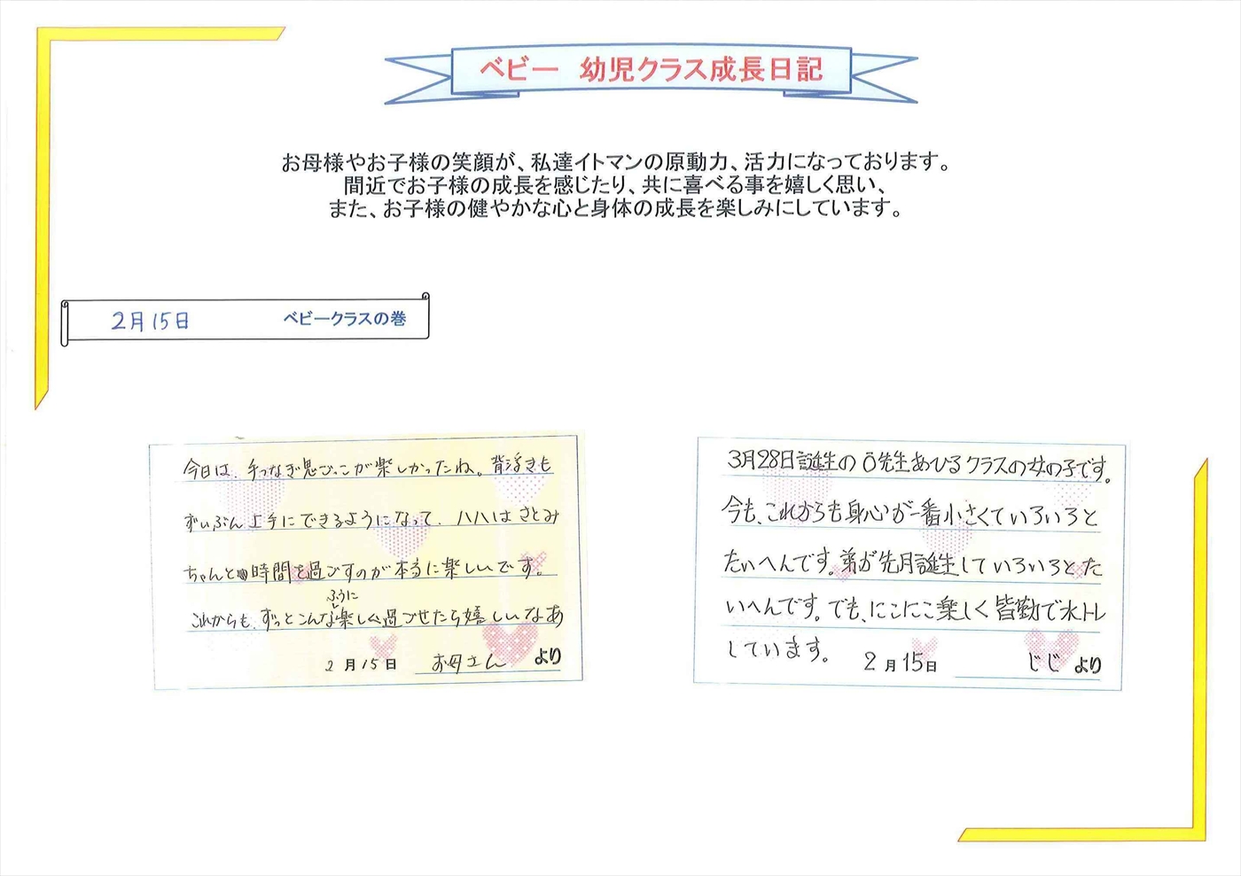カメクラスからおじいちゃんとプールに入っているたまちんおじいちゃんと一緒にいつも笑顔で、ジャンプする時には必ず「じじー」と呼んでいますねこれからも休まず元気な姿を先生に見せてねfrom おおもり