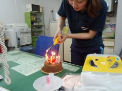 ケーキを前に自分でろうそくを立てて火をつけて・・・上手にできました。