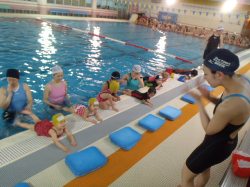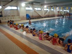 ママ達が泳ぐ前にぼく達もふりこやキック、うさぎさんでウォーミングアップ。