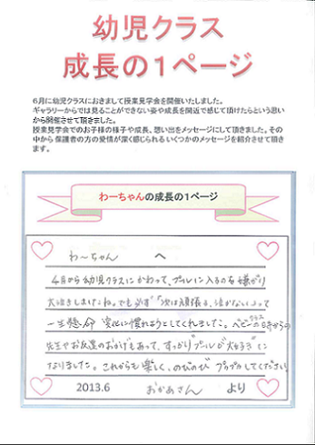 6月に授業見学会を開催いたしました。ギャラリーからでは見ることができない姿や成長を間近で感じて頂きました。そこでの様子や成長、想い出をメッセージにして頂きました。